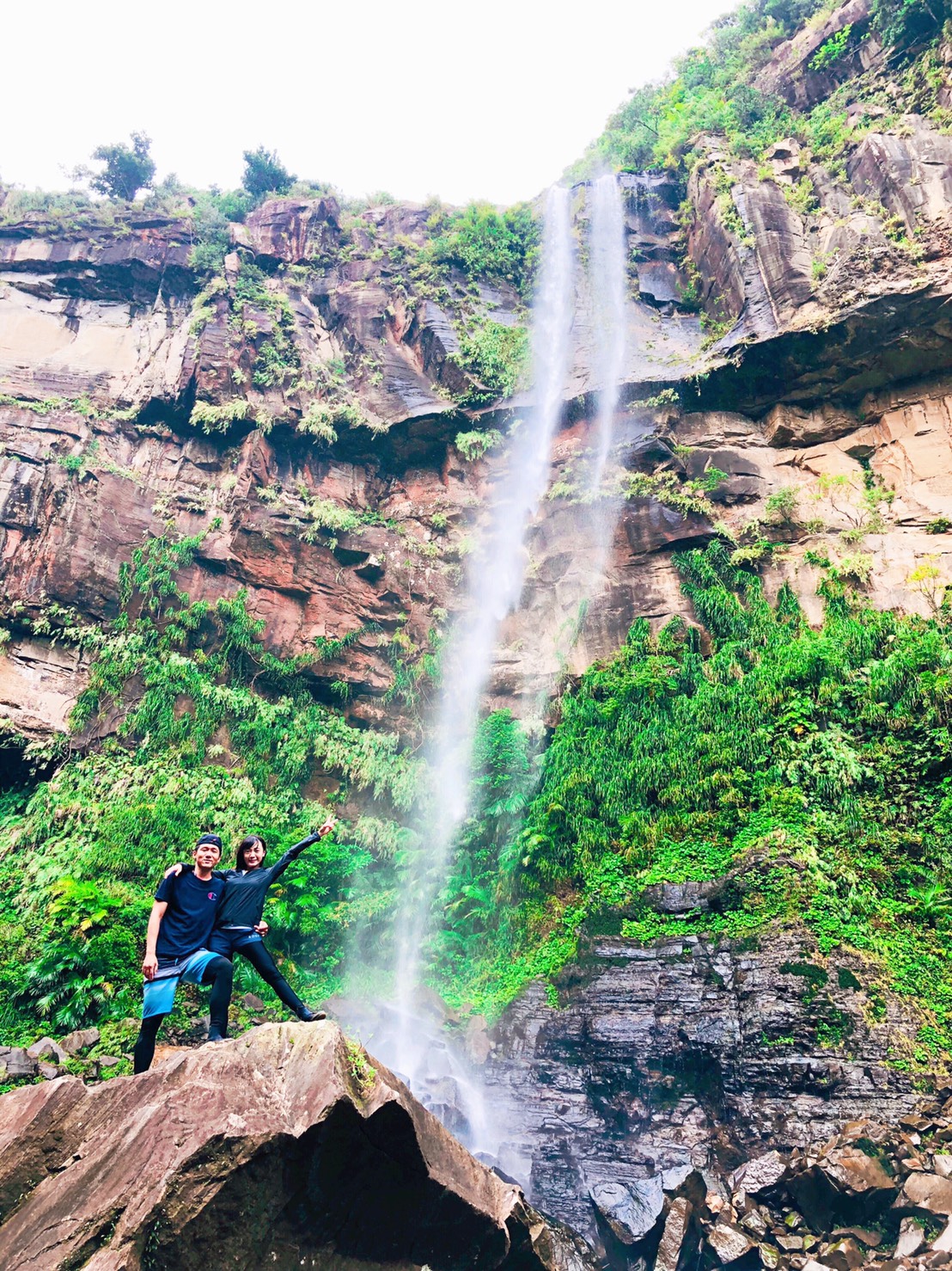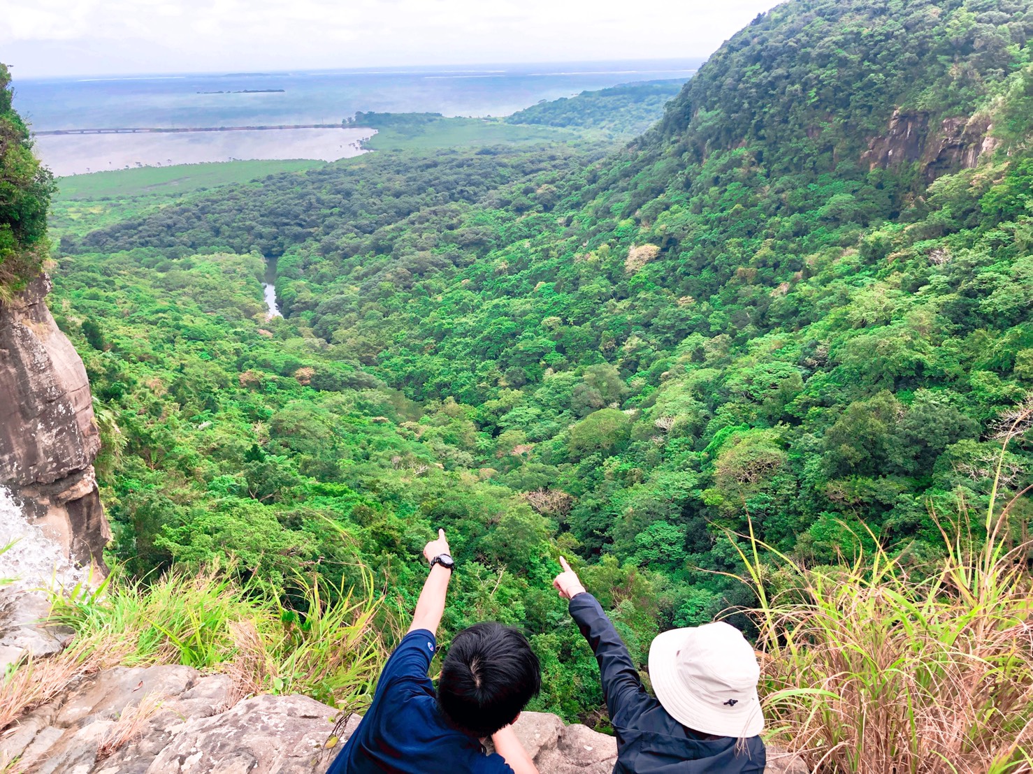 The view from the top of the waterfall is a large panorama of the emerald green sea.